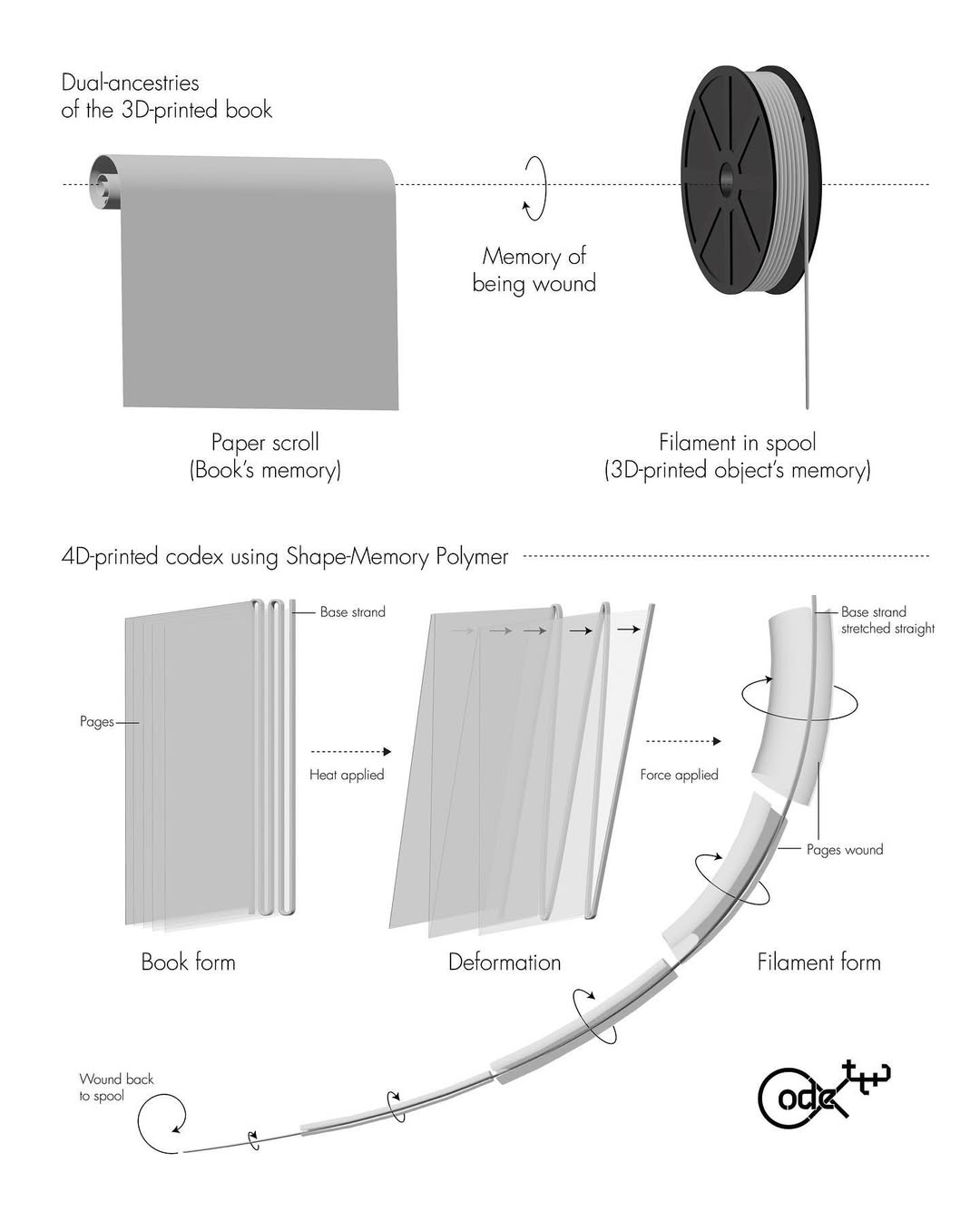 The 3D printed book (codex) remembers its dual-ancestries. Winding back time, the 3D printed book remembers being wound: materially, as plastic filament in a spool; historically, as papyrus/paper wound/rolled as scrolls.