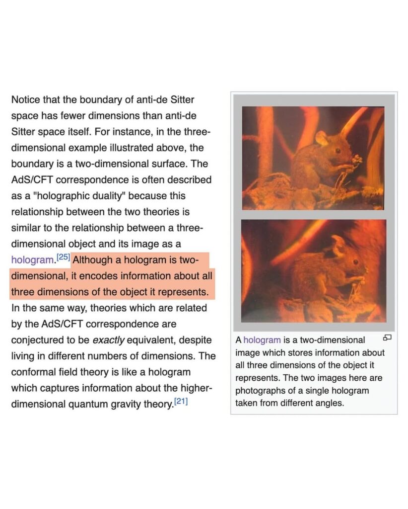 In print terminology, the familiar security “3D” foil prints are described as having optical ‘holographic’ properties—apparent ‘3D’ objects within a flat “2D” surface. A whole picture imprinted/encoded on a surface. Holograms in our three-dimensional (spatial) experiences can therefore be described as 3D ‘information’ of a volume equivalently stored on the surface/boundary.