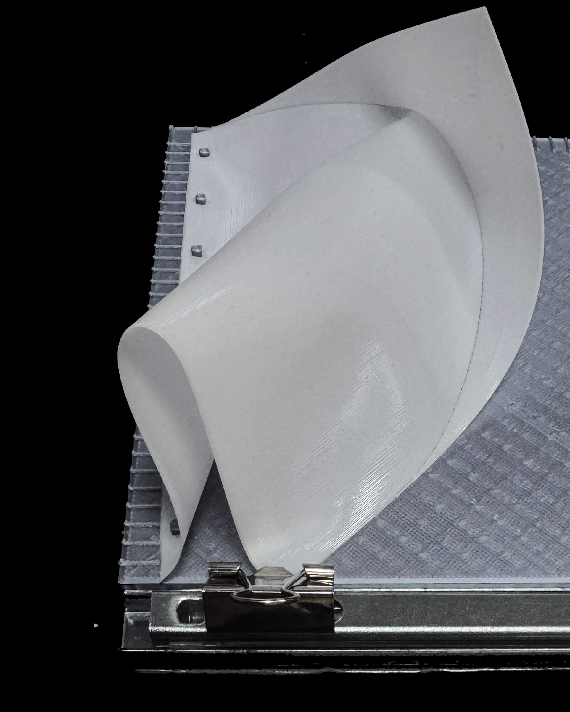 The volumetric press offers a unique opportunity through 3D printing for precise control not only over the direction of an equivalent to ‘grain’, but also over its laying pattern. While the concept of pulp fibres is not applicable in 3D printing, the 3D printed substrate is similarly affected by its filling pattern (Fig. 2). These patterns are typically used to adjust structural properties parametrically. In the context of the volumetric press, however, they hold the key to embedding material properties into the 3D printed page. Besides programming how the page curls, it is even possible to embed mechanical transformations, such as a self-dog-earring page corner (Fig. 1) when pinched in the bottom edge (think pinch-to-bookmark). Such agency over the material properties of book pages affords novel interactions, added accessibility, and creative dynamics between the reader and the book-object. Figure 1 shows a prototype printed with 2 layers (0.4mm thick), with a uniform first layer pattern and programmed second layer pattern (90° rectilinear and concentric patterns) following a curved “dog-ear” shape on the top right corner. This prototype was printed on 95A TPU on a Prusa XL.