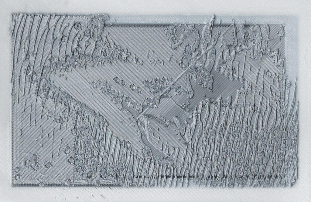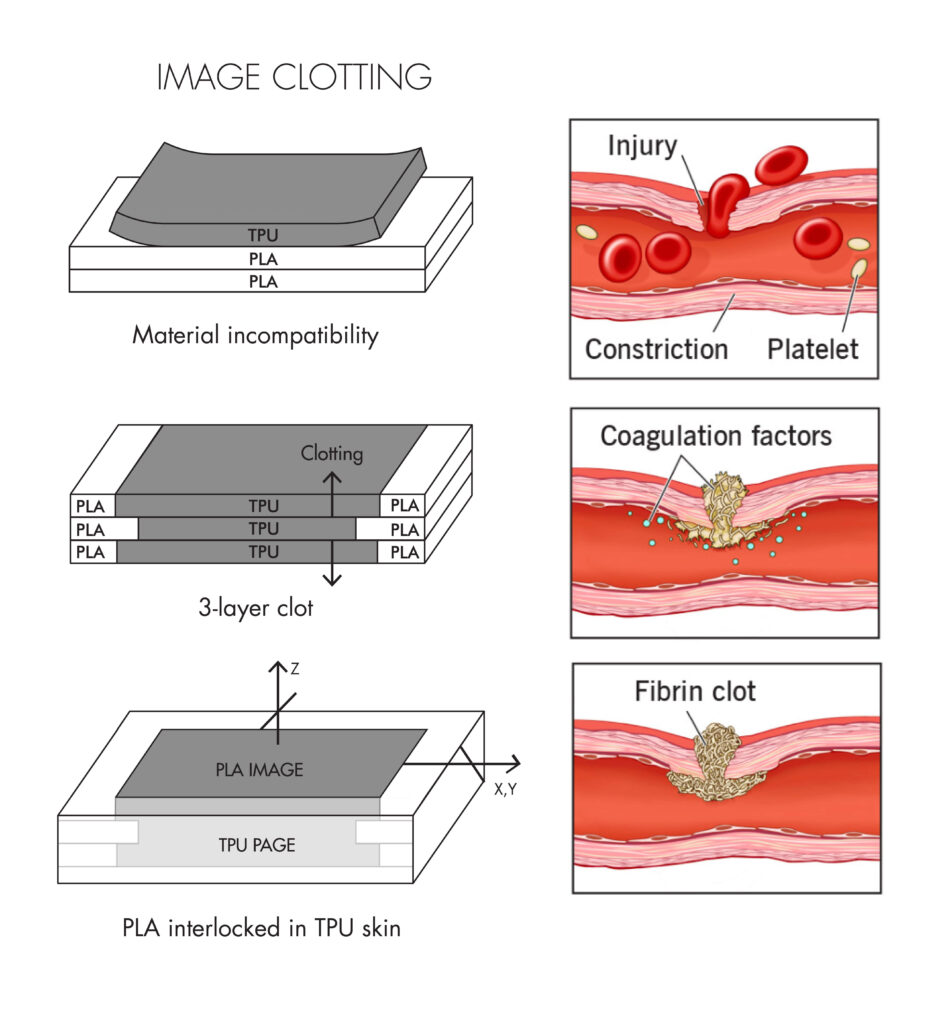 This Z-axis “bleed” effectively acts as a surface-level seal, containing the non-binding PLA on a TPU page. Thematically and technically, this method resembles a blood clotting process (Fig. 2 and 3), not simply extending outward, but using itself to form a surface-level seal that prevents internal material from dislodging. With just three-layer height profile, the clotting method can contain a materially-heterogeneous image reliably in place on the page substrate (Fig. 4).