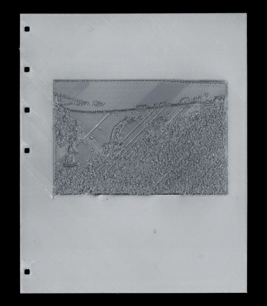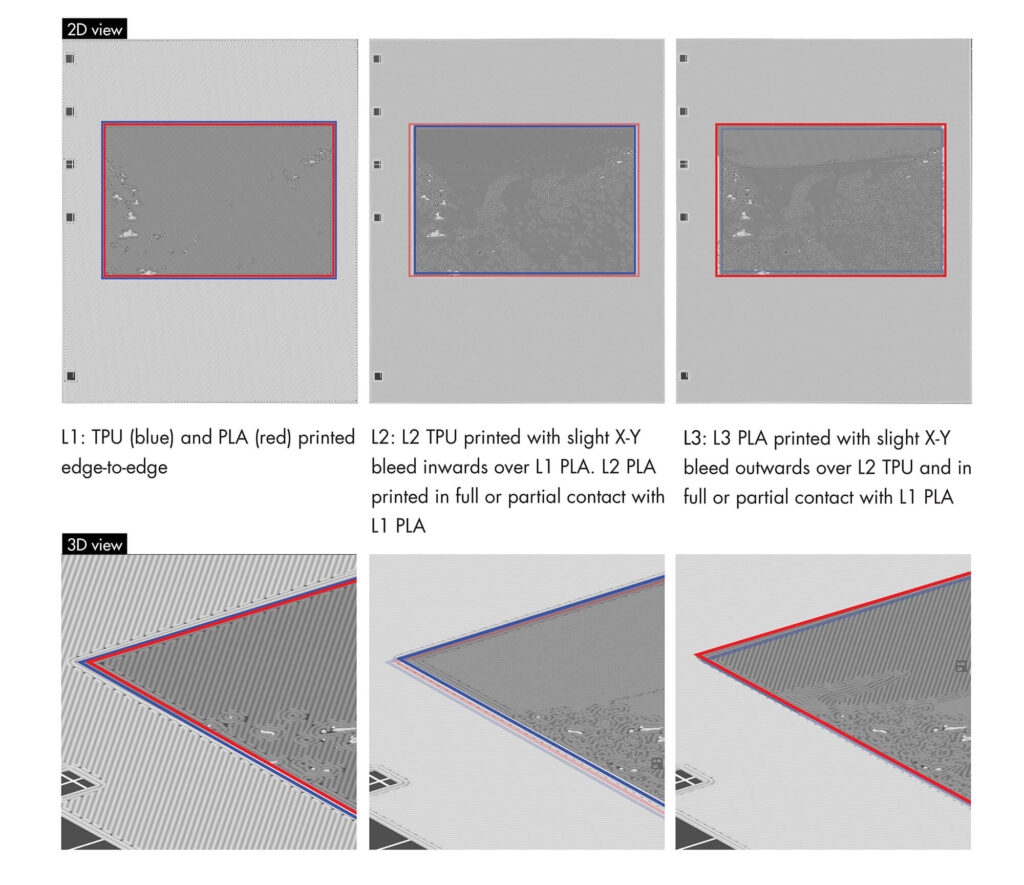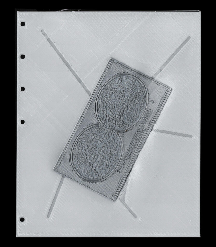 The volumetric press, by contrast, is less concerned with multi-material object fabrication and more with the multi-material composition of the page. TPU pages are ideal for their pliability, yet the material is limited in variety. Access to multi-material 3D printed page introduces new possibilities such as expanded colour palettes, textures, and functional properties. This experiment explores the feasibility of mechanical material bonding inspired by interlocking methods to print PLA-based images onto/into TPU substrates (Fig. 1).