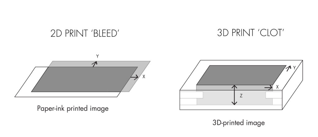 In conventional print terminology, a ‘bleed’ refers to an image element that extends beyond the trim edge in the X and Y axes to account for mechanical tolerances and limitations in both printing and cutting processes. These bleeds that ‘overflow’—as if printed images are viscous even after the ink dries—are later trimmed, ensuring the final printed area appears edge-to-edge. In contrast, the volumetric press does not require trimming, as its substrates are printed to precise dimensions. Nonetheless, the principle of the image bleed⁴ can be adapted here, not across the X-Y plane, but along the Z-axis of the voluminous print.