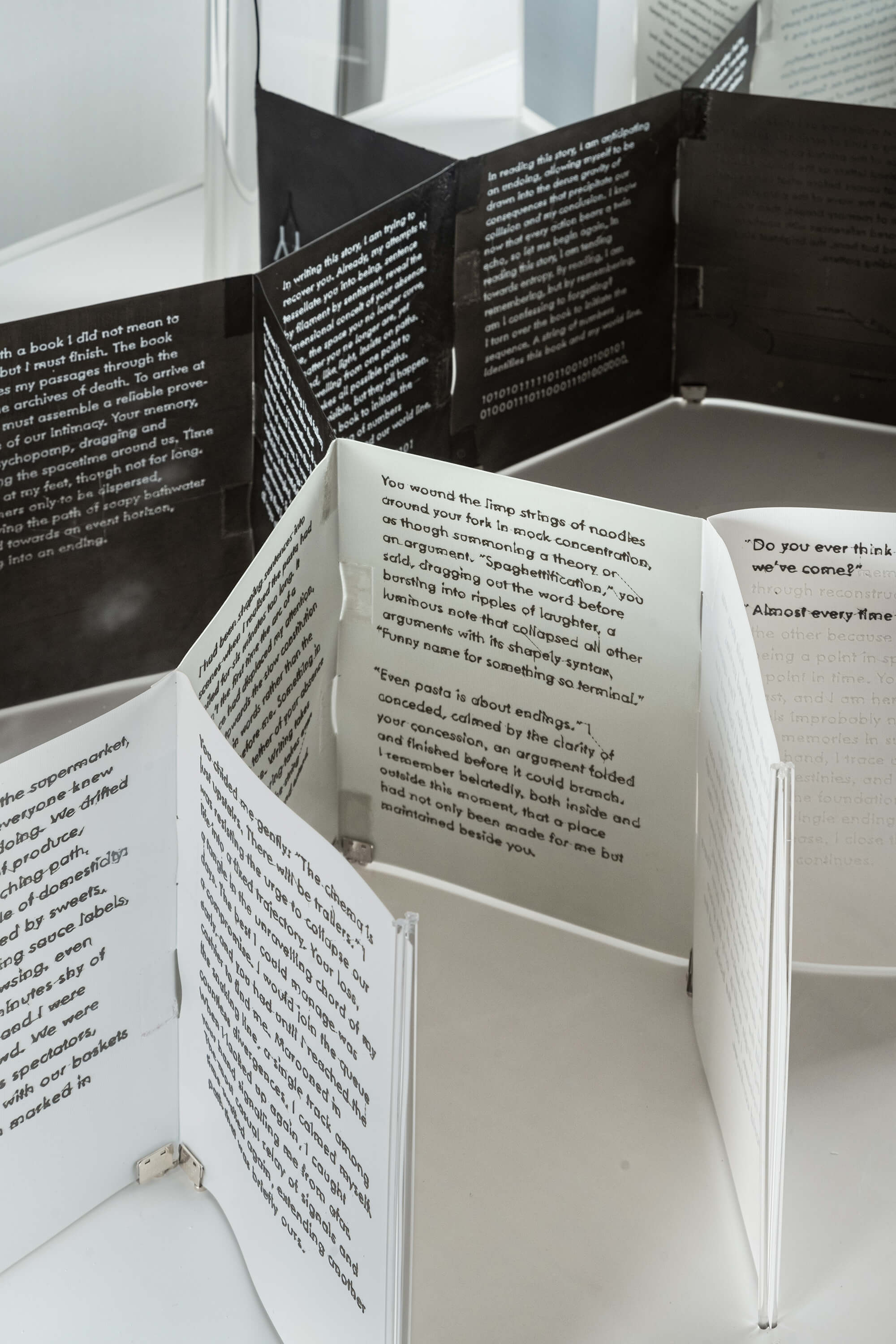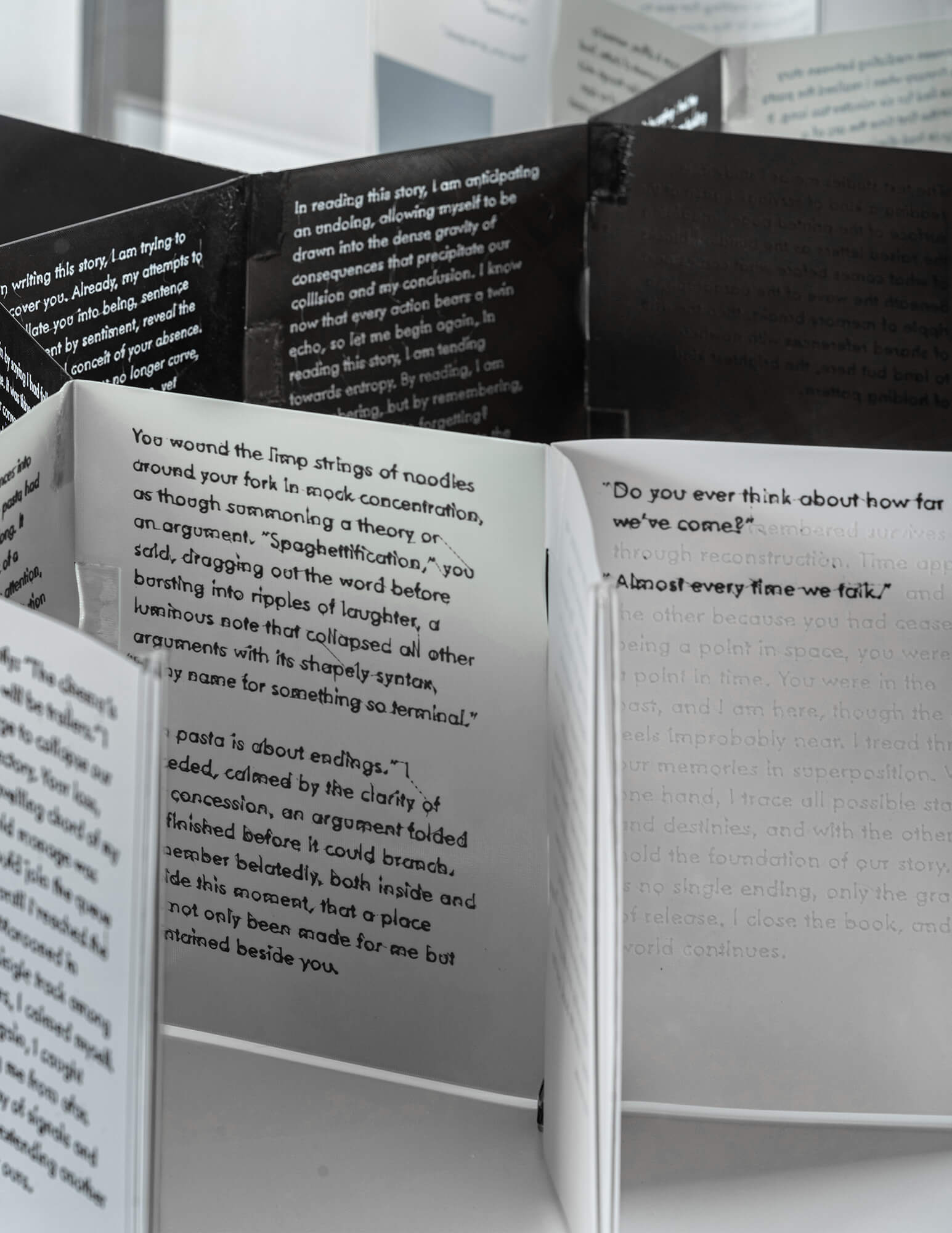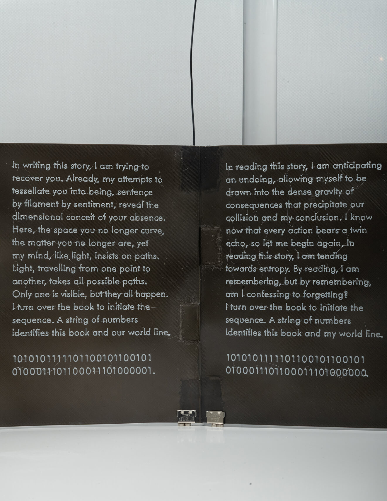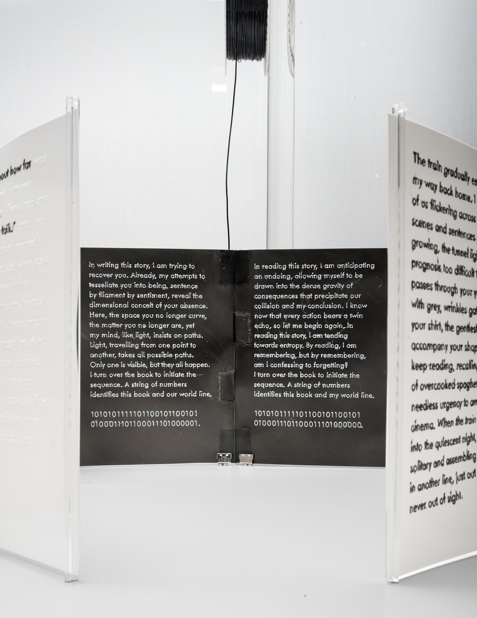 Many-Folds is a 3D printed book with branching prose that unspools across branching pages, unwinding narratives and worldlines from a single filament spool.