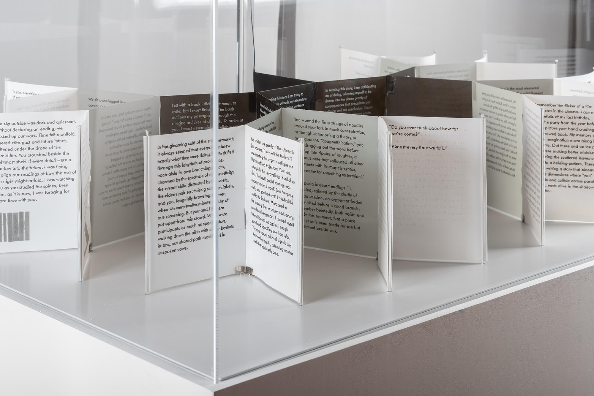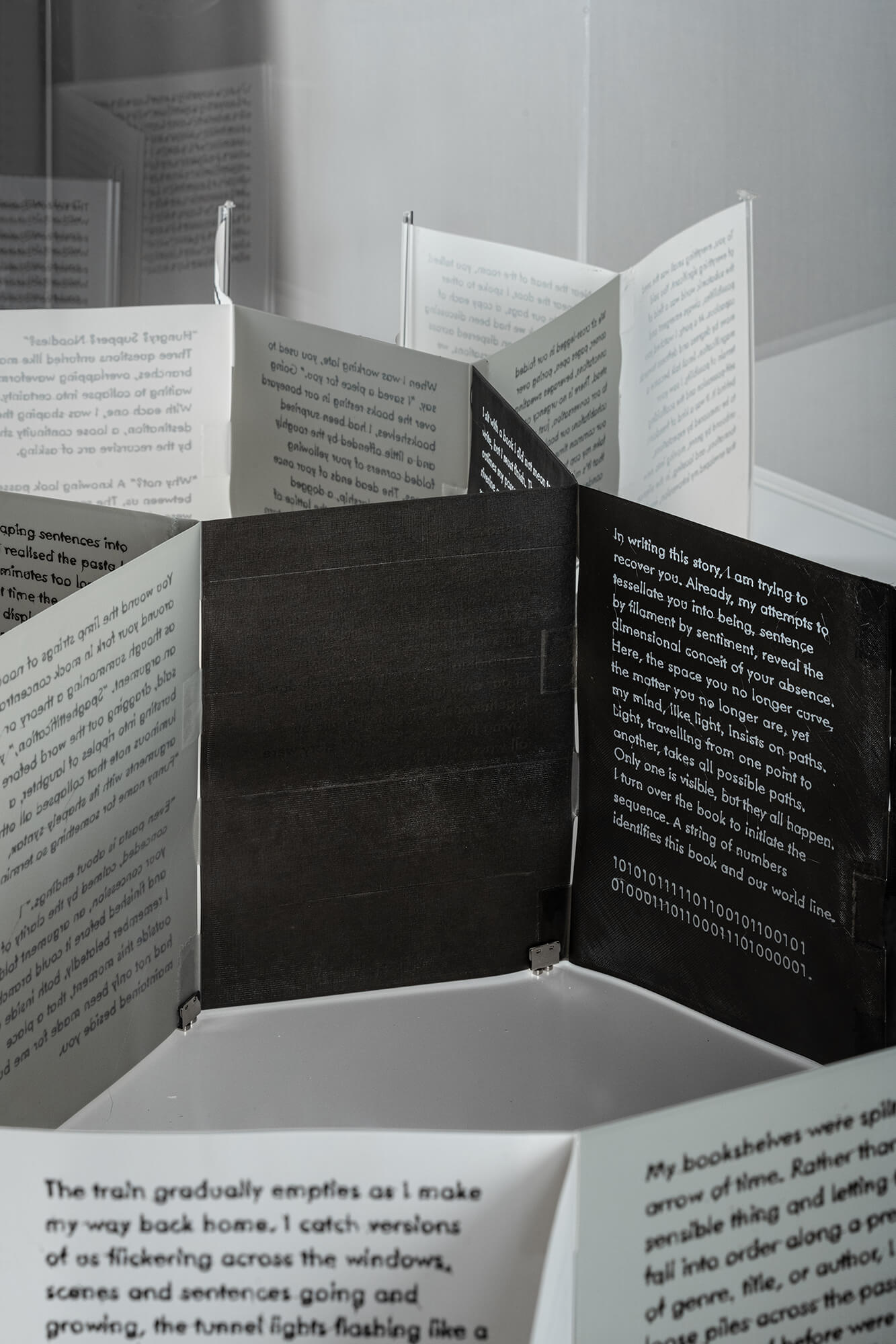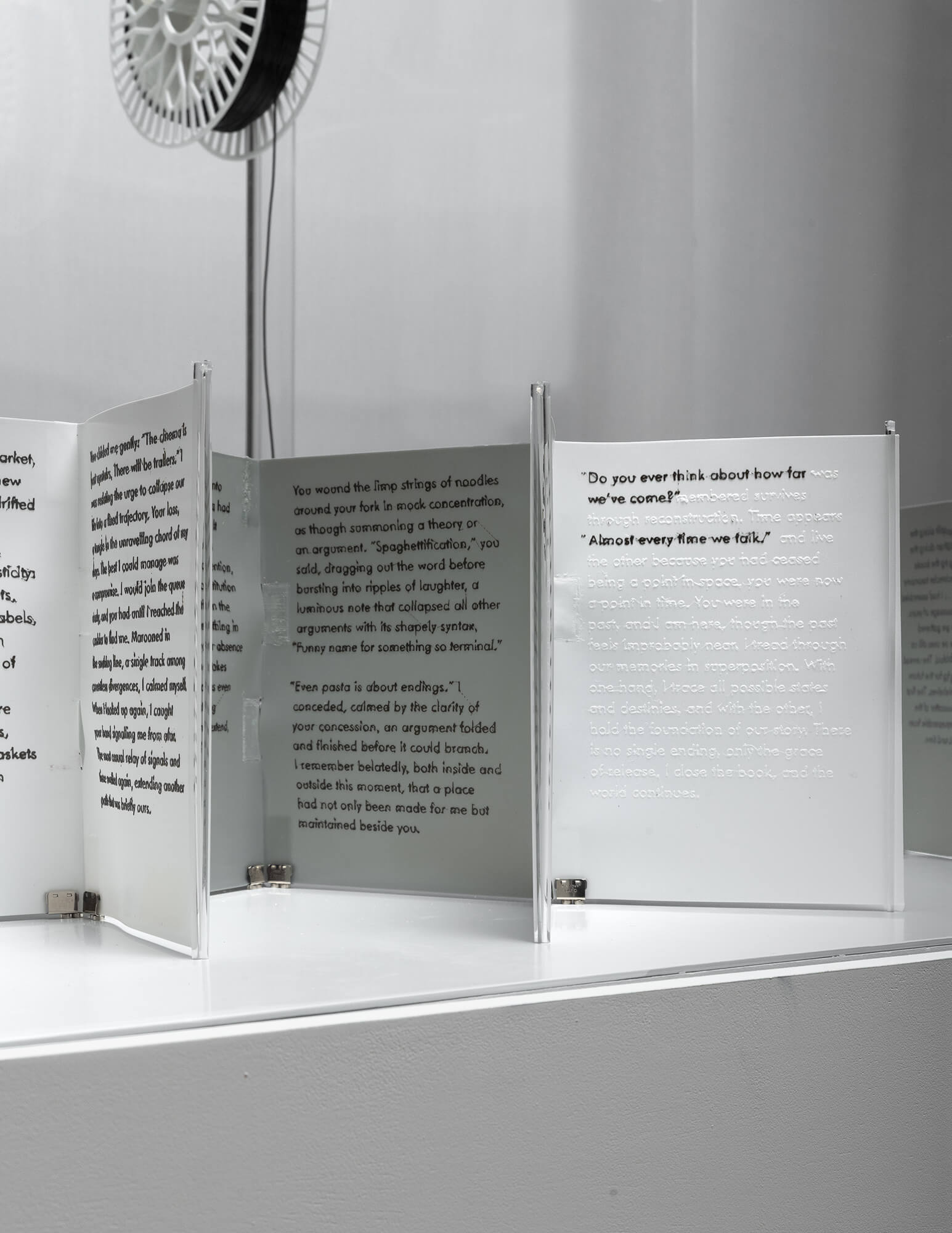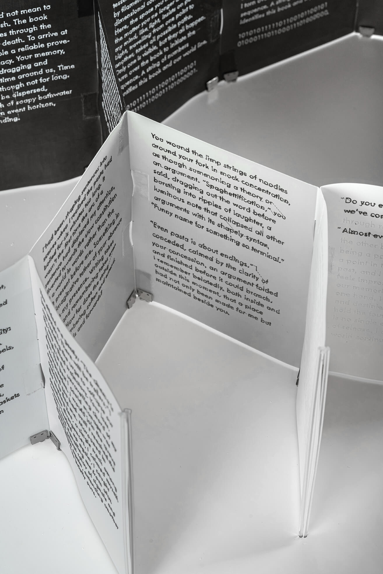Many-Folds is a 3D printed book with branching prose that unspools across branching pages, unwinding narratives and worldlines from a single filament spool.