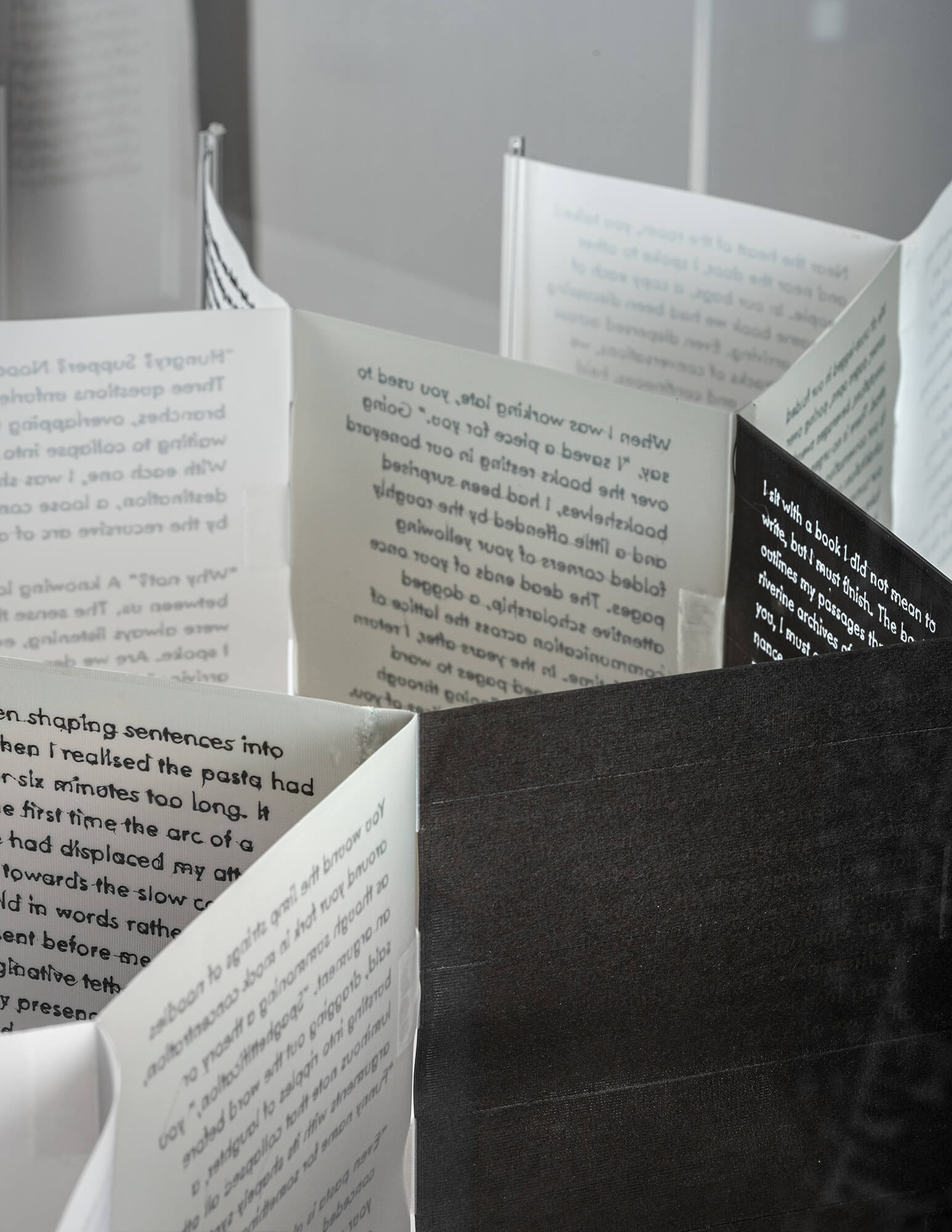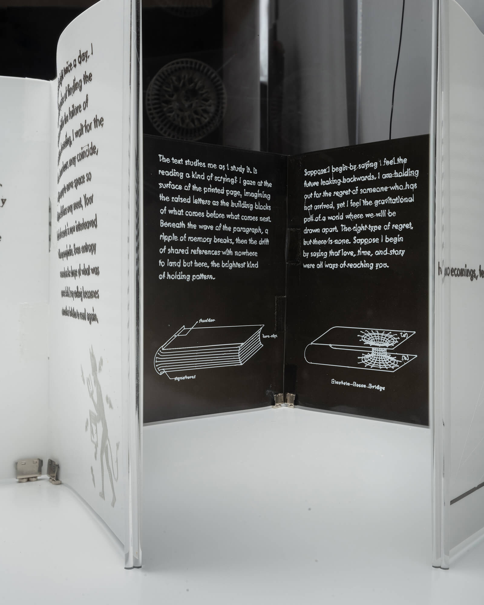 Drawing an affinity between the branching syntax of the MWI and the book form, Many-Folds unfolds through an arborescent structure that echoes the MWI’s branching schematic. As the world thins through subsequent bifurcations, each spread is also 3D printed progressively thinner. Diverging from a centrally bound spine, the book is assembled through a network of decentralised bindings—pages branch orthogonally with fore-edges bound to the folded edge of subsequent spreads through “double-slit” attachments. The end of each page begets iteration, functioning as spines for coextending pages.