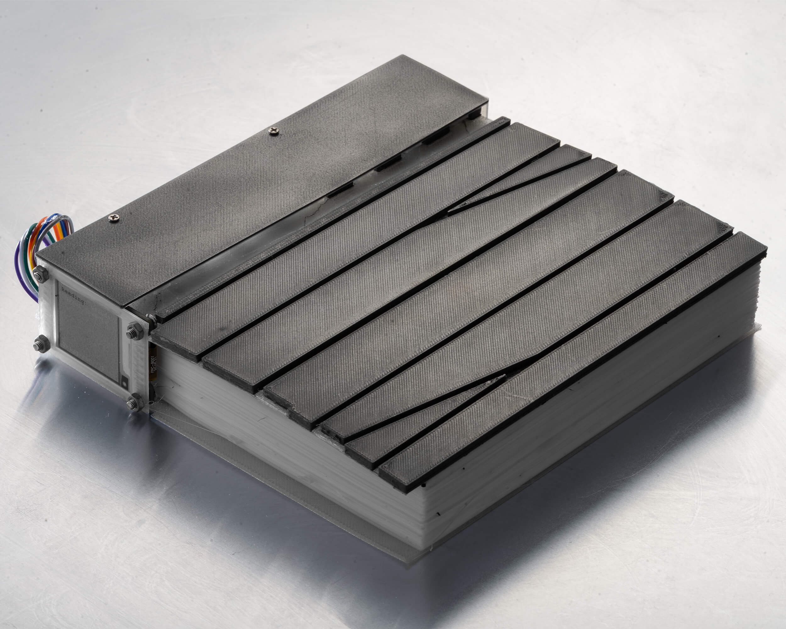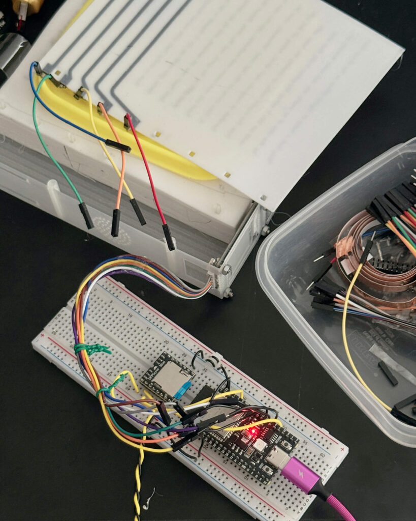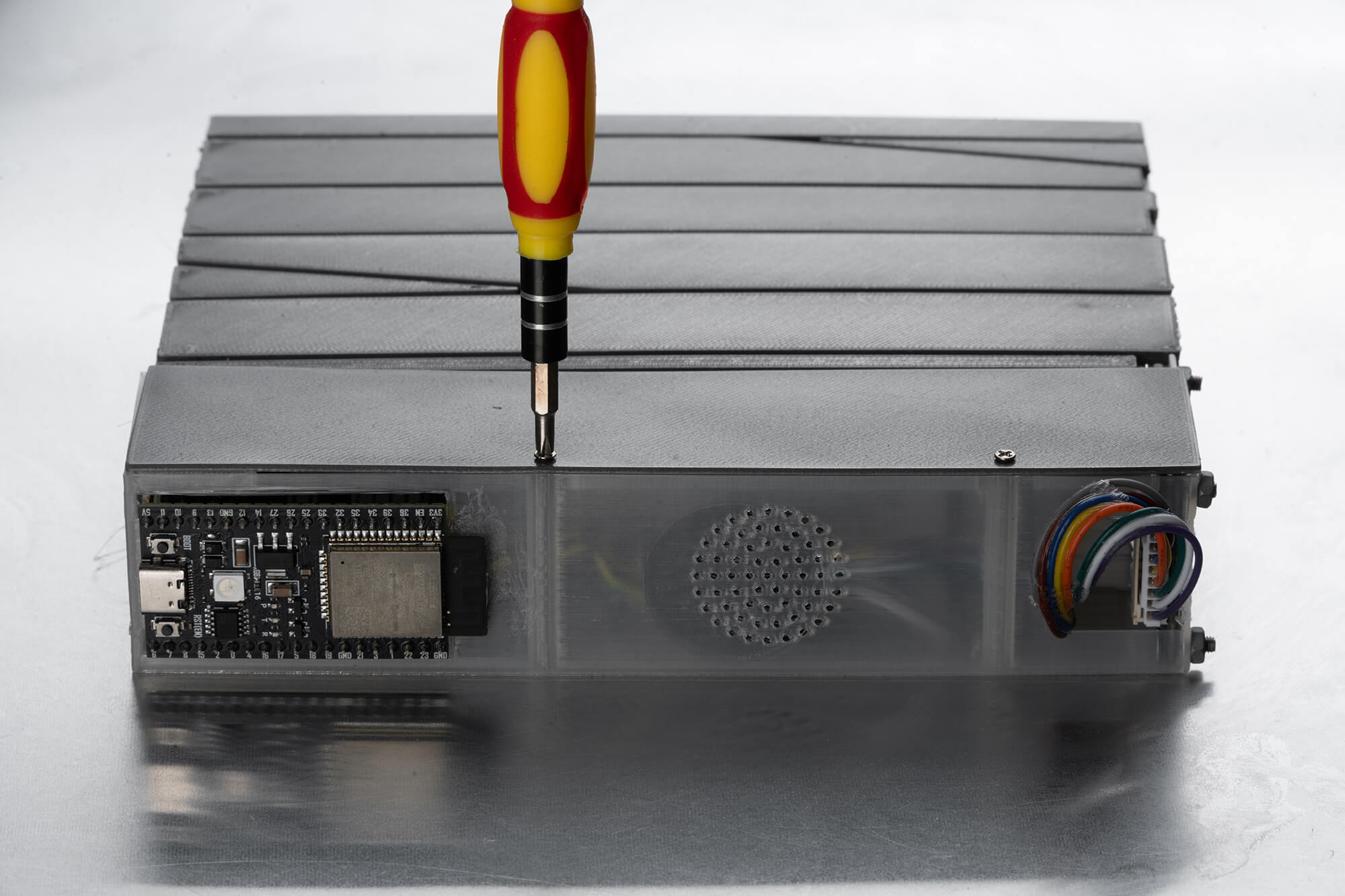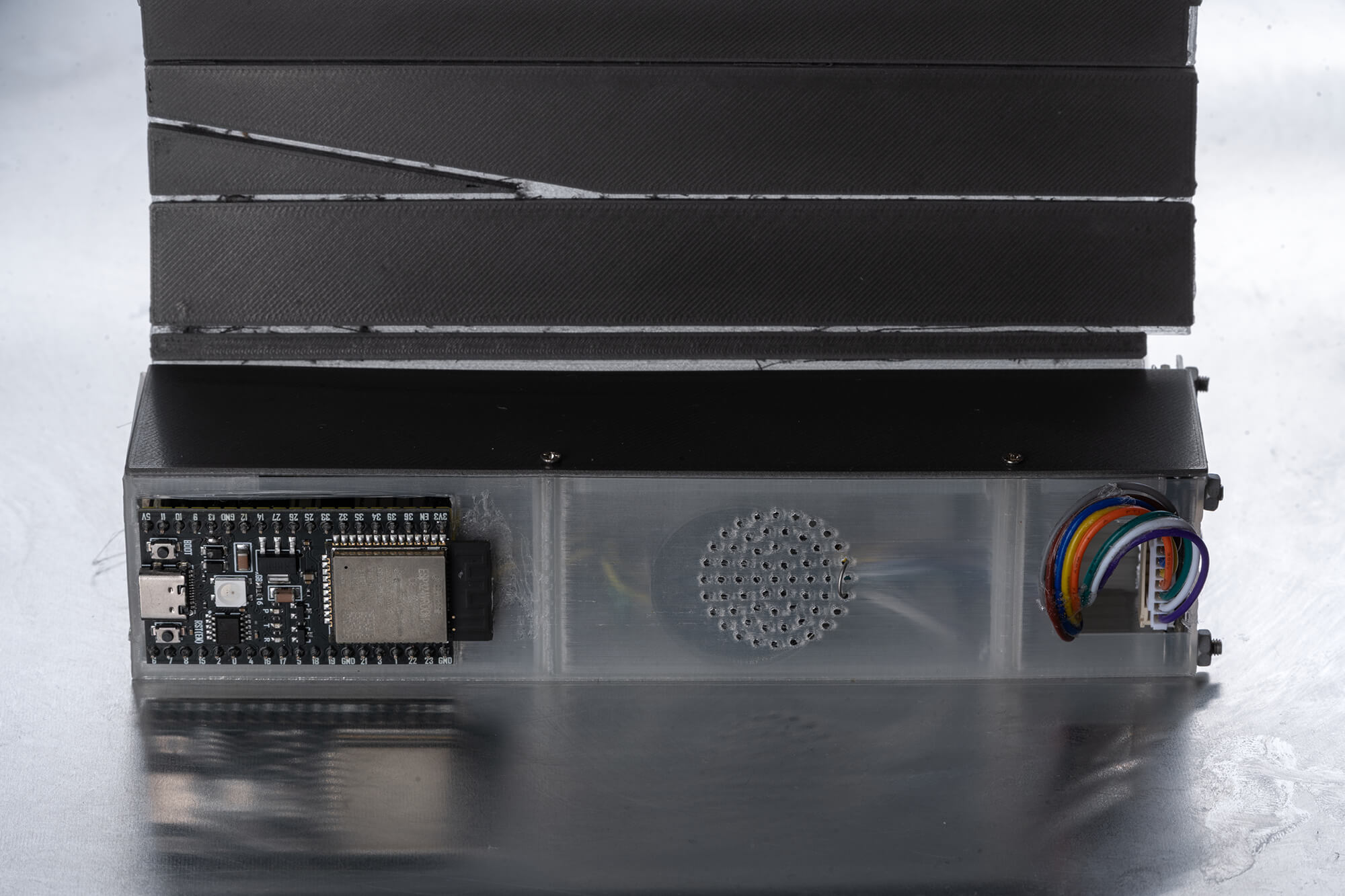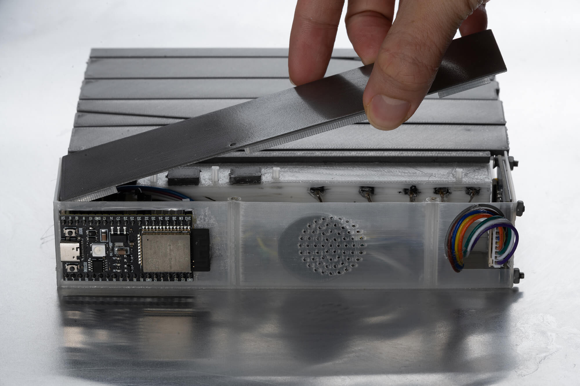 3D printed / Conductive Thermoplastic polyurethane, metal-infused Polylactic Acid, microcontroller with capacitive touch sensors, audio speaker and SD card modules, E-ink screen, wires