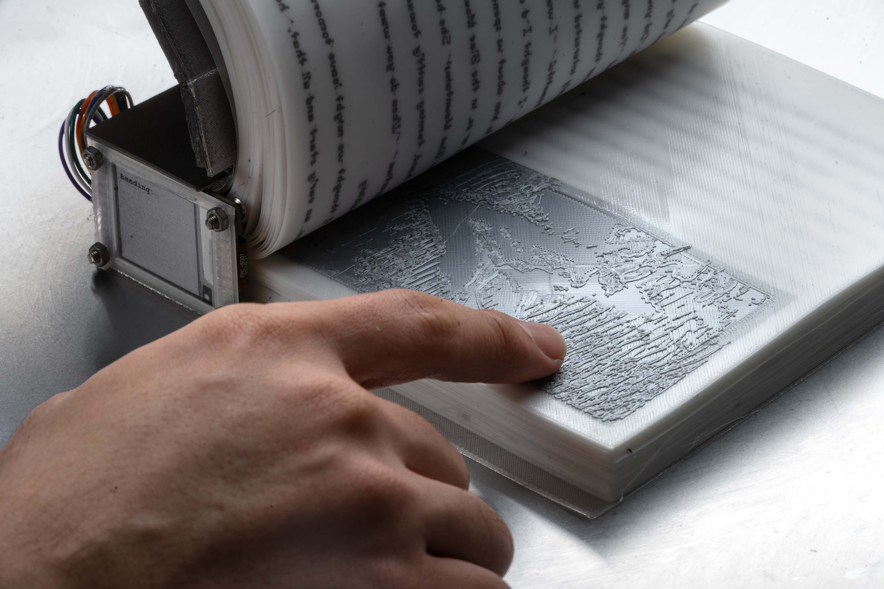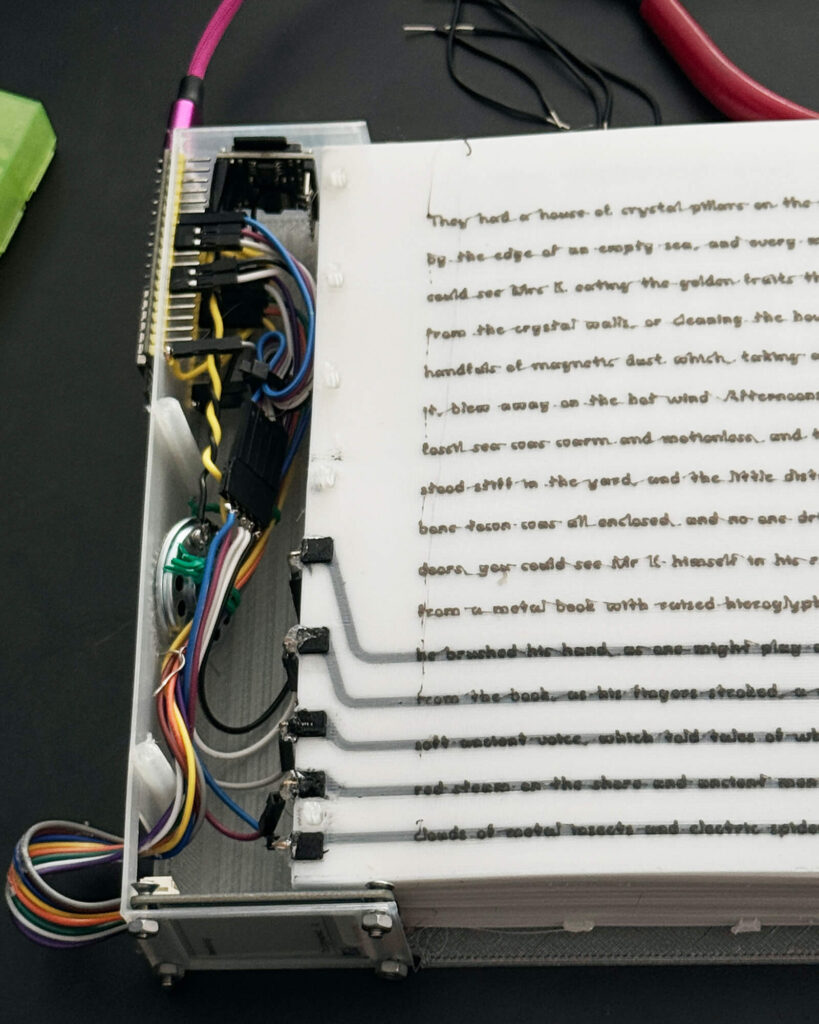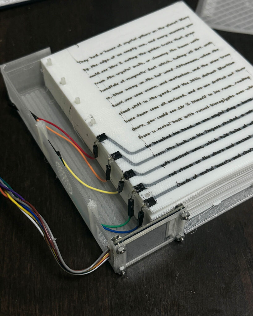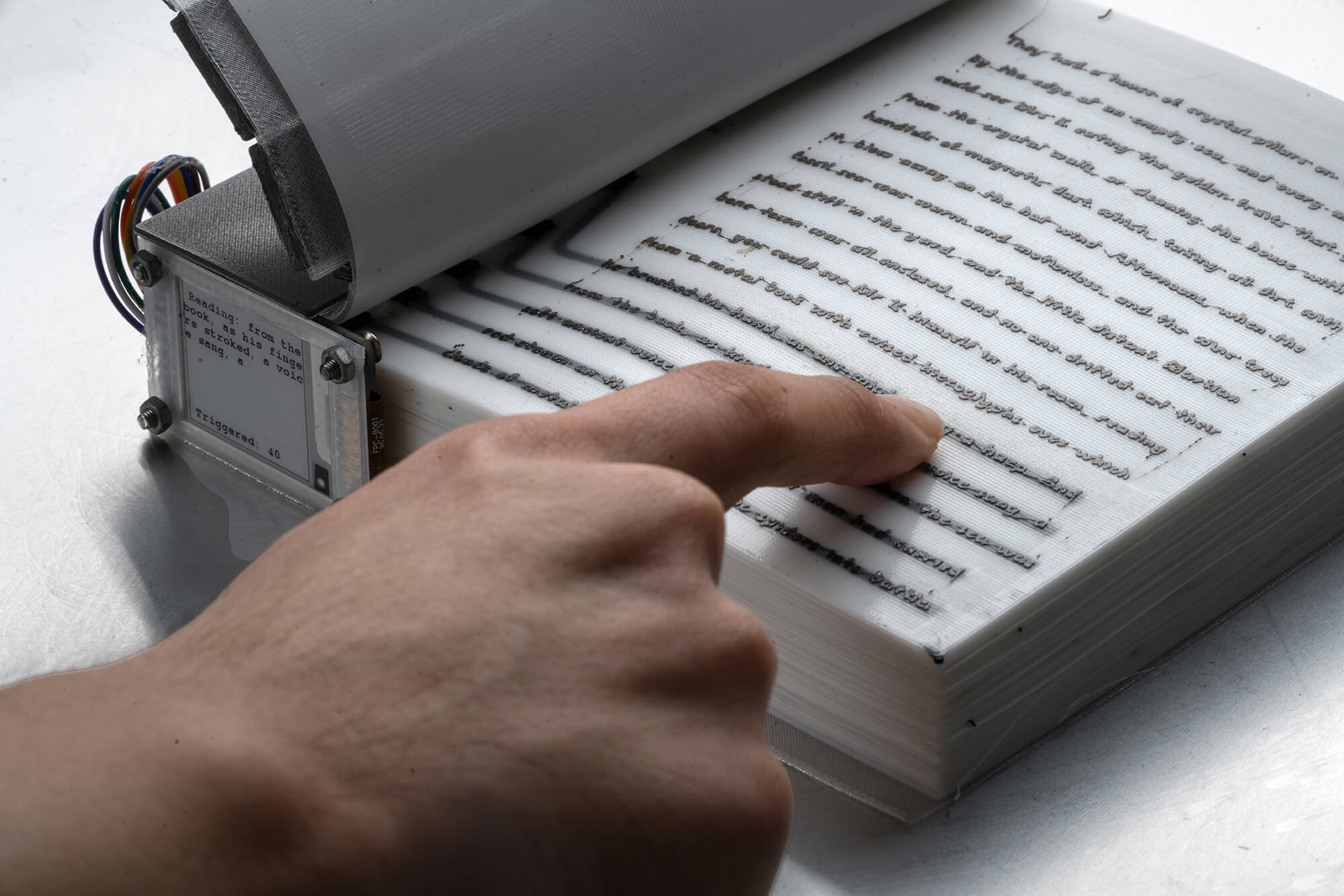 METALLY is a proof-of-concept 3D printed book containing printed circuit pages with conductive TPU traces (under few lines of text) connected to capacitive touch sensors. It also houses an integrated audio speaker module and electronic ink display within a 3D printed steel-infused PLA spine and cover.