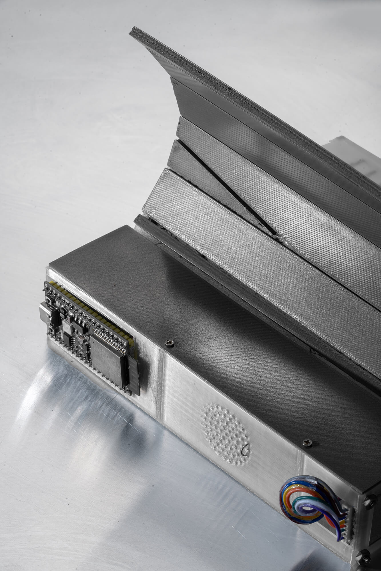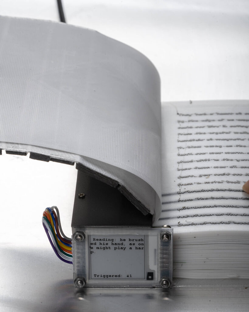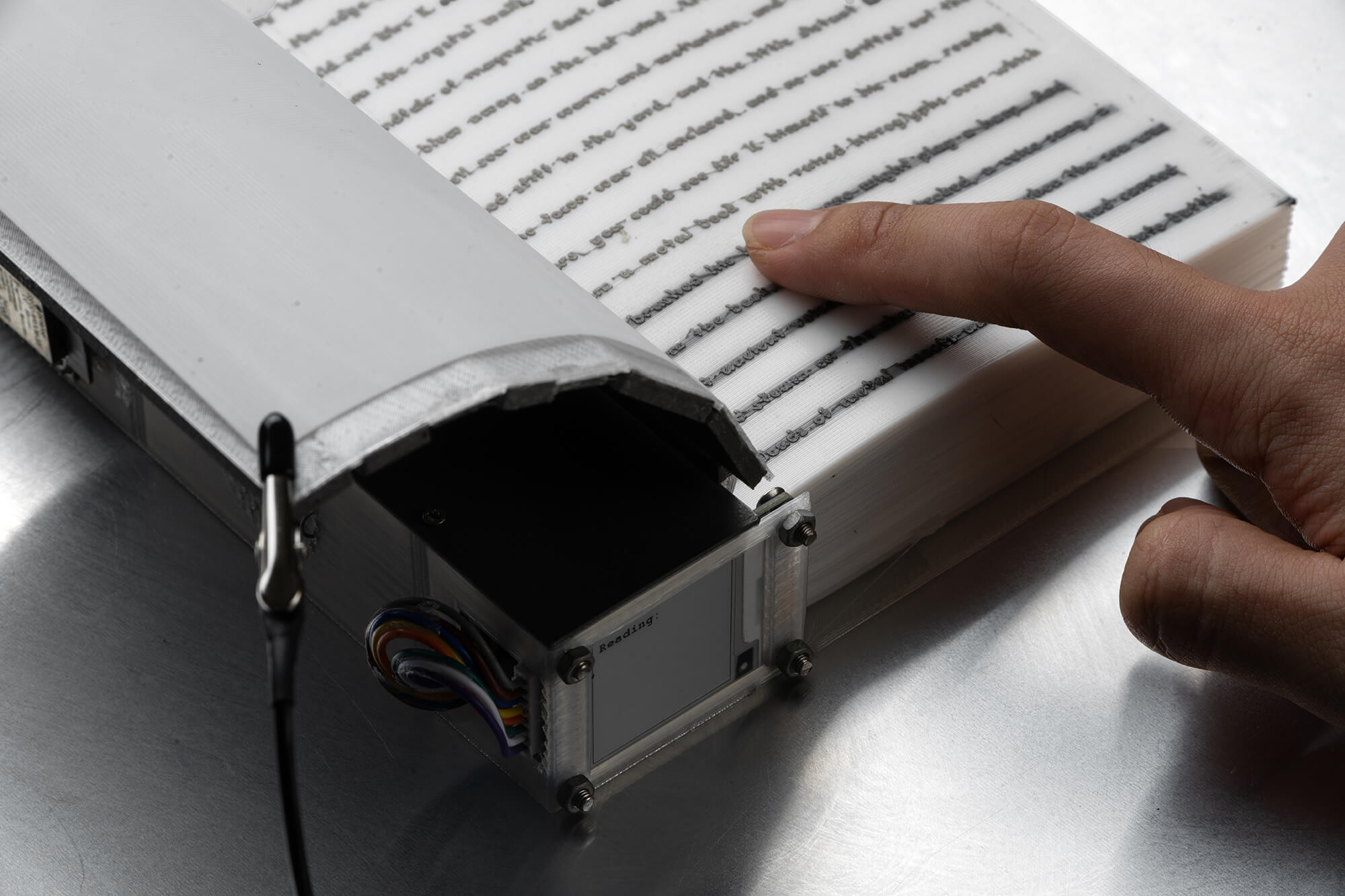 METALLY is a proof-of-concept 3D printed book containing printed circuit pages with conductive TPU traces (under few lines of text) connected to capacitive touch sensors. It also houses an integrated audio speaker module and electronic ink display within a 3D printed steel-infused PLA spine and cover.