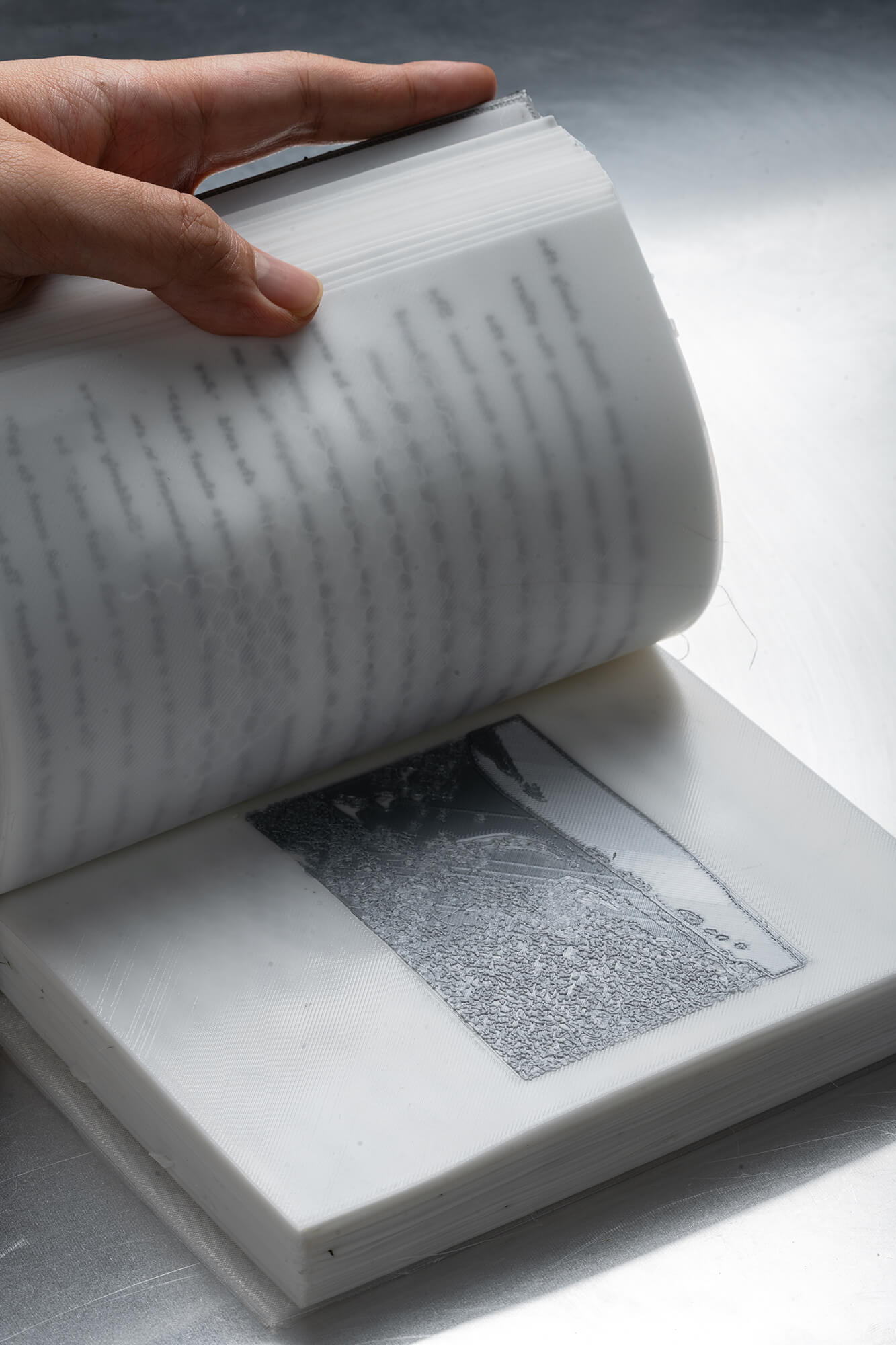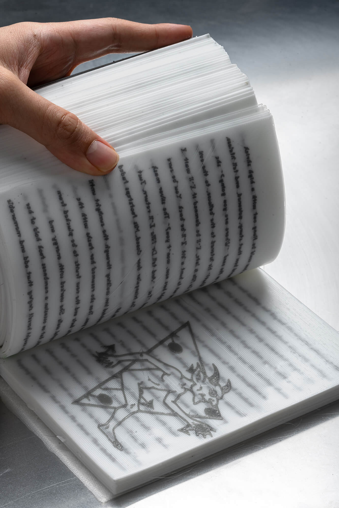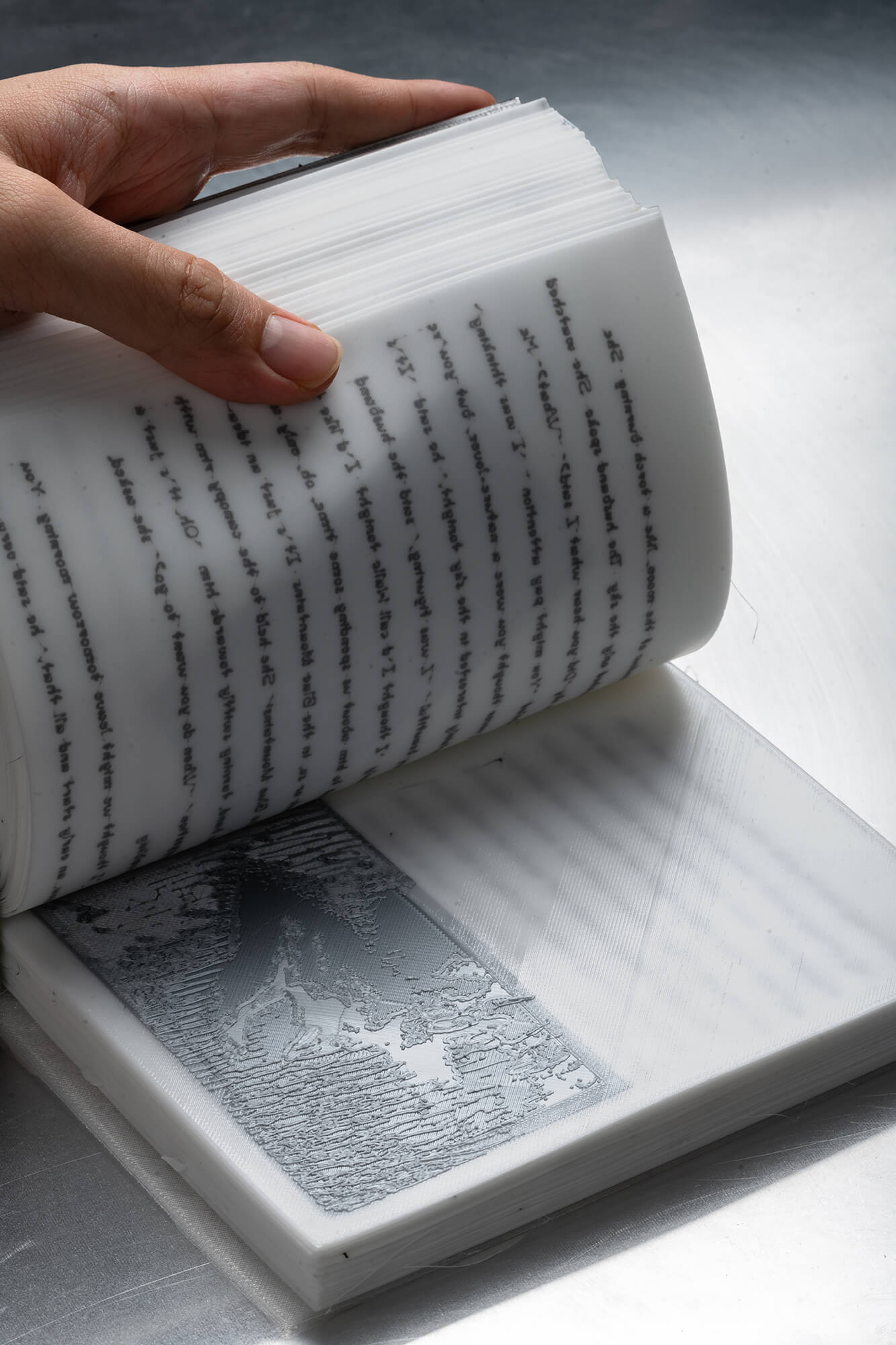 Through the volumetric press, Bradbury’s speculative “multi-dimensional” book-object is no longer science-fiction but a plausible reality. A counterfactual object pressed through the page.