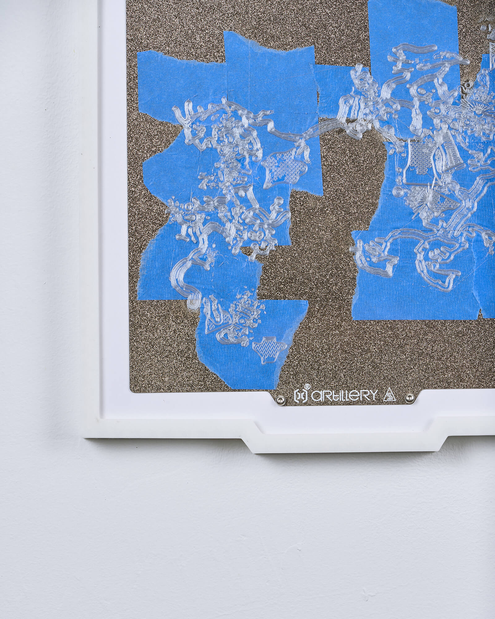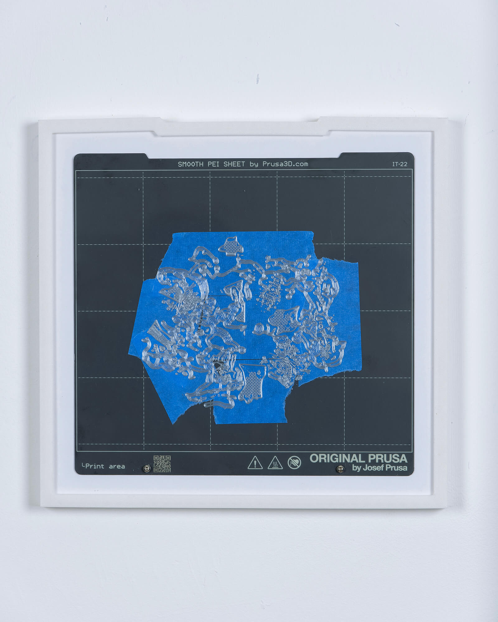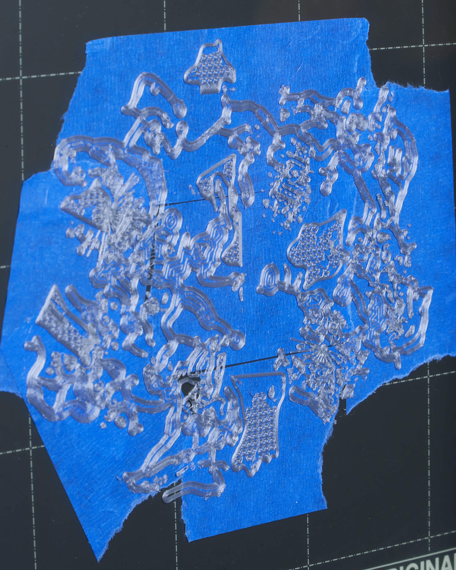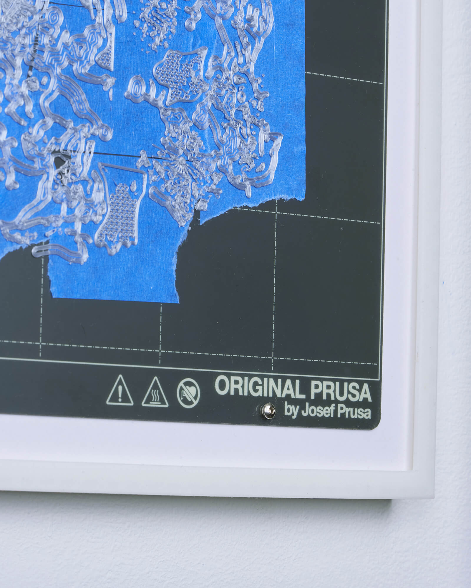 The use of blue masking tape (commonly known as painter’s tape) dates back to the early days of desktop 3D printing, when print beds often struggled with adhesion issues. Applying painter’s tape to the build surface quickly gained popularity after it was found to both improve first-layer adhesion—dramatically increasing print success rates—and protect the bed from residue and wear. In this work, the presence of painter’s tape on this work’s 3D printing “canvas” is a direct nod to its namesake in painting (both as a tool of decorative painting and as an artistic medium), establishing a link between the practices of object-making and mark-making.