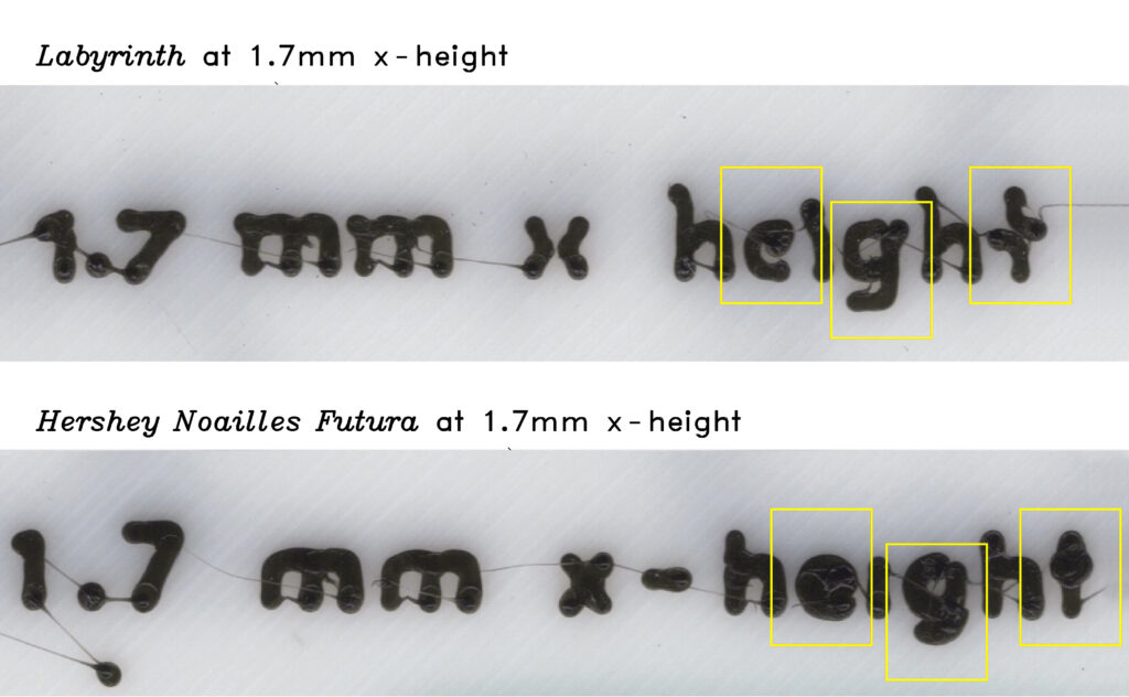 Fig. 3. Fidelity differences between Labyrinth and non-path trapped typefaces at 1.7mm x-height printed in PLA.