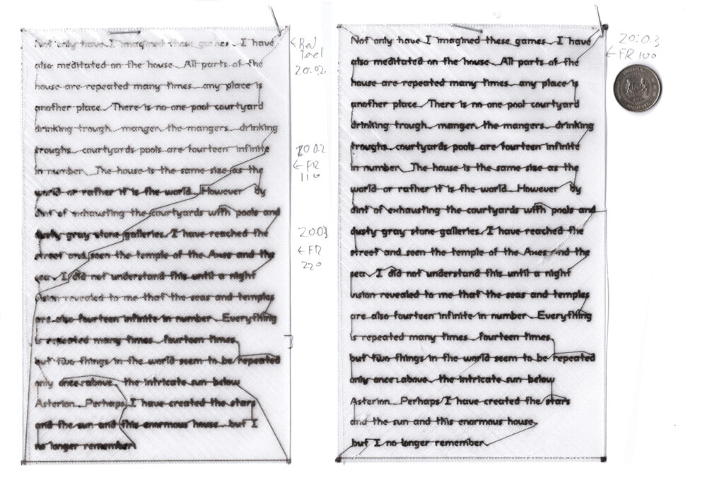 3D printing’s traversal mechanisms calculate routes based on the efficiency of entire paths, considering both proximity and positional values. While printing texts, point connections are based on proximity rather than logic, often connecting ascenders/descenders of surrounding letters, sometimes across lines rather than completing the text line, resulting in strays and tortuous paths across text blocks and paragraphs.