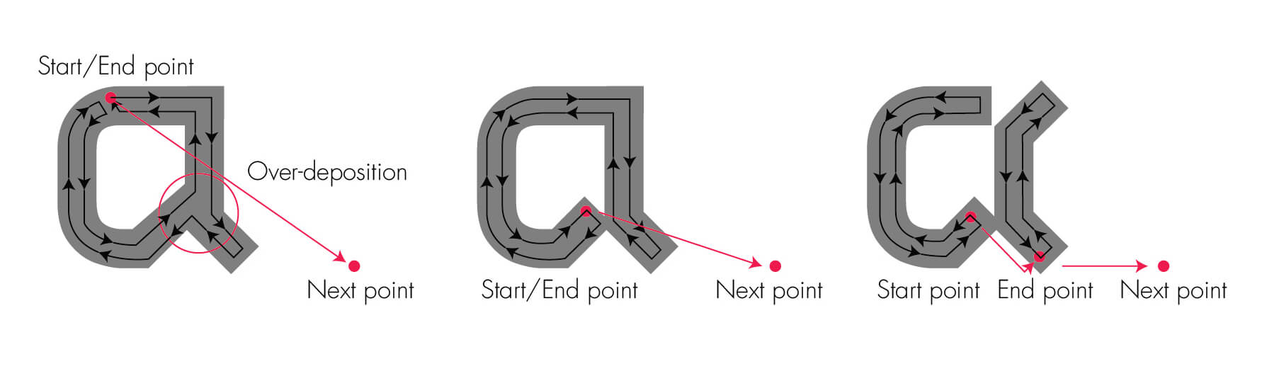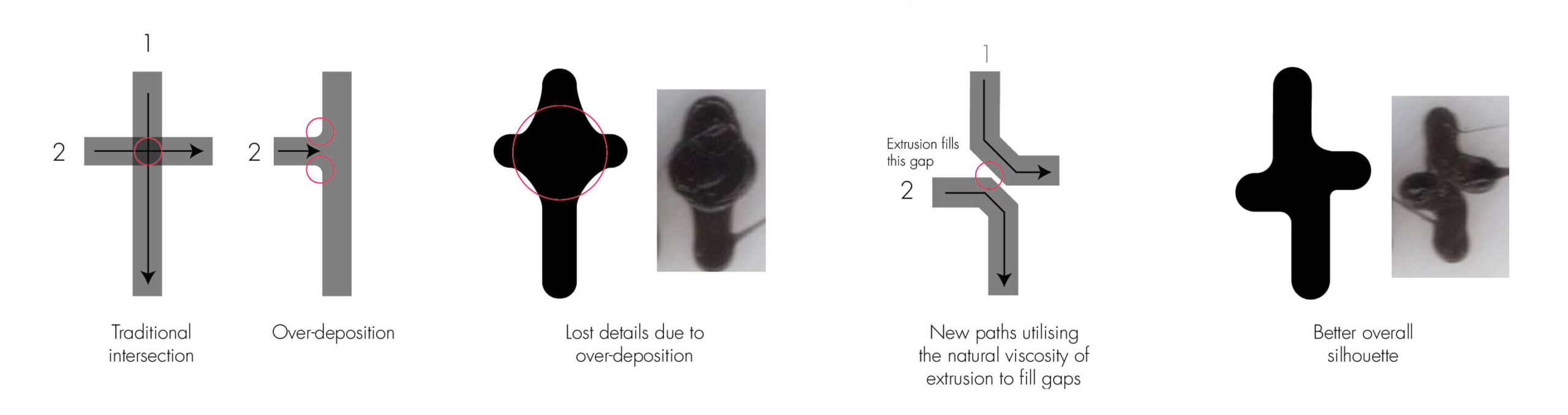 2. Intersecting lines will over-deposit material at the intersection, resulting in lost details
