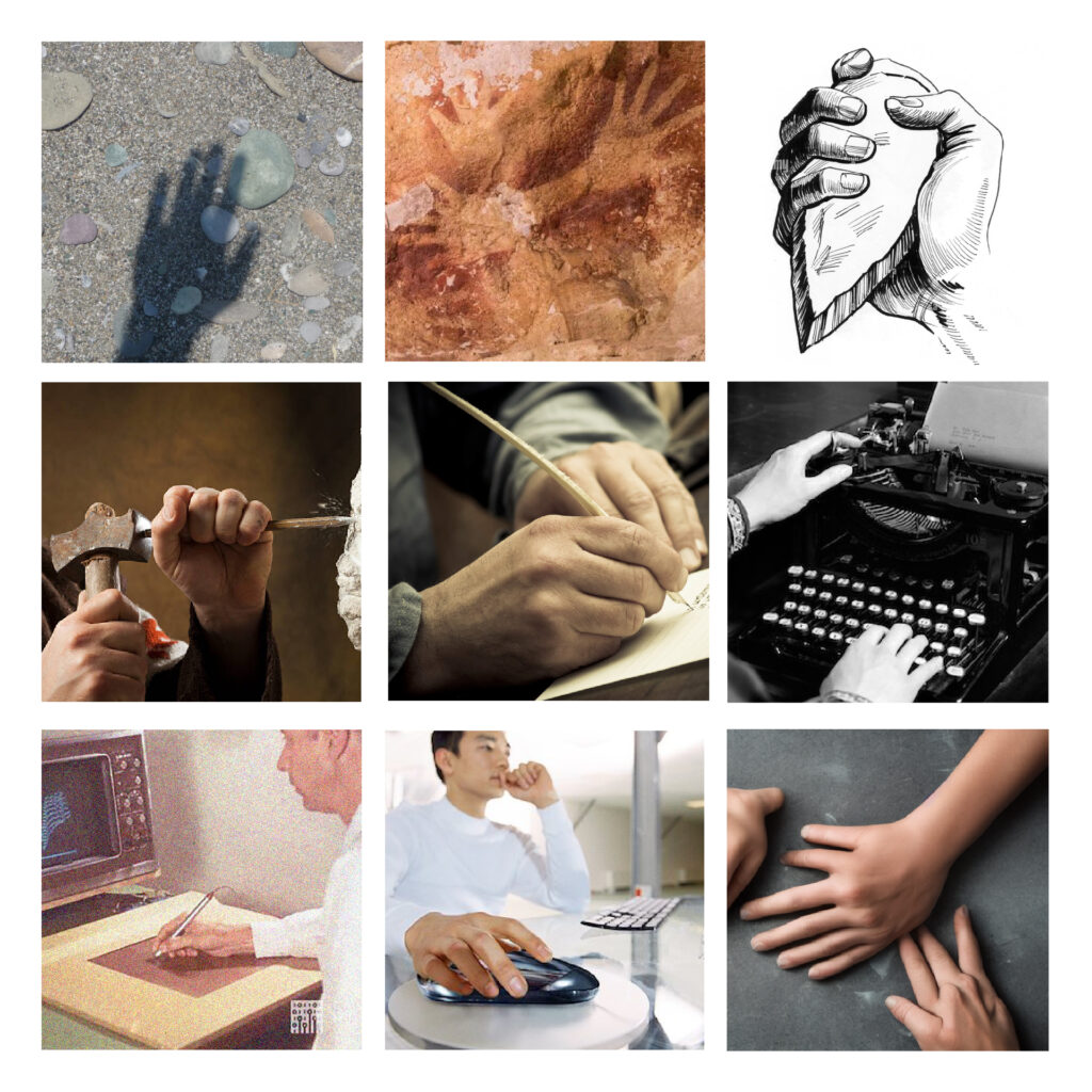 Taking the broadest definition of the word “mark”, shadows can be thought of as humanity’s first “marks” on the world. Though impermanent, shadows cast by the overhead sun or silhouettes projected by campfires in dark caves were perhaps our first “images”. Then, with the fire’s soot, more permanent marks like stencilled handprints were made on cave walls. Tree barks were scratched, marks carved into clay/stone. For tens of millennia, marks made by hand were guided by sight. Marked surfaces were always close to our digits, with the eye witnessing the hand/tool directly contacting a surface to imprint.