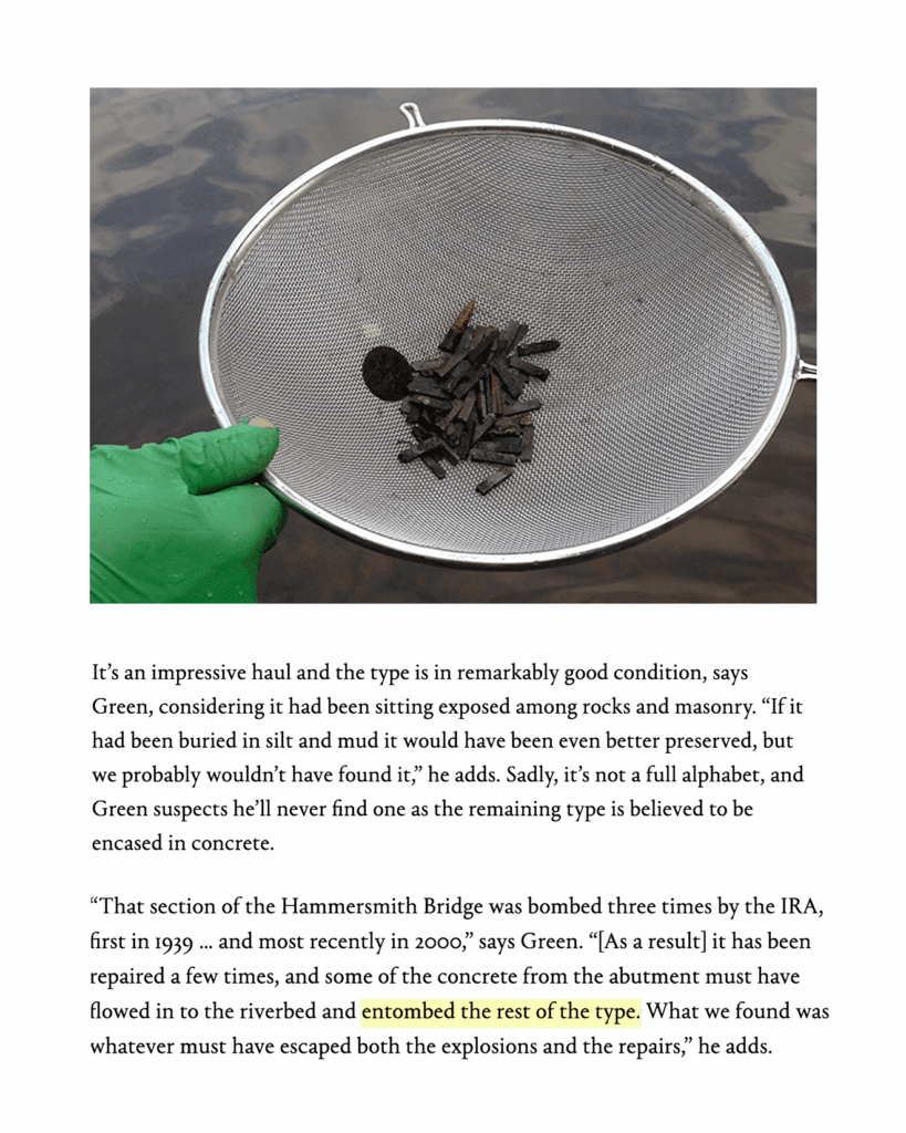 The type would remain in its “watery grave” under Hammersmith Bridge for almost a century, till 2014, when type designer Robert Green, who had successfully located the exact dump location through Cobden-Sanderson’s diary, decided to single-handedly exhume the lost type. He found the first sort, a lowercase “v”, followed by two more in his first search: spelling “v”, “i”, “e”.