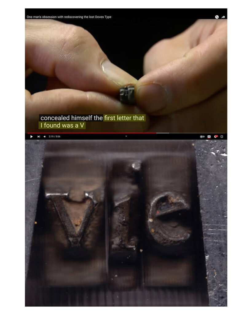 While we do not have records of Cobden-Sanderson’s last words, the first words uttered by the exhumed typeface seem to hint at a certain vocabulary, imprinted by a bitter separation. Hundreds of sorts have been found since Green’s efforts, enabling him to successfully digitise a faithful revival of the lost Doves Roman as data in a font file. Typefaces no longer require physical sorts or even print to manifest. This is an instance of the separation of type from print (and its physicality).