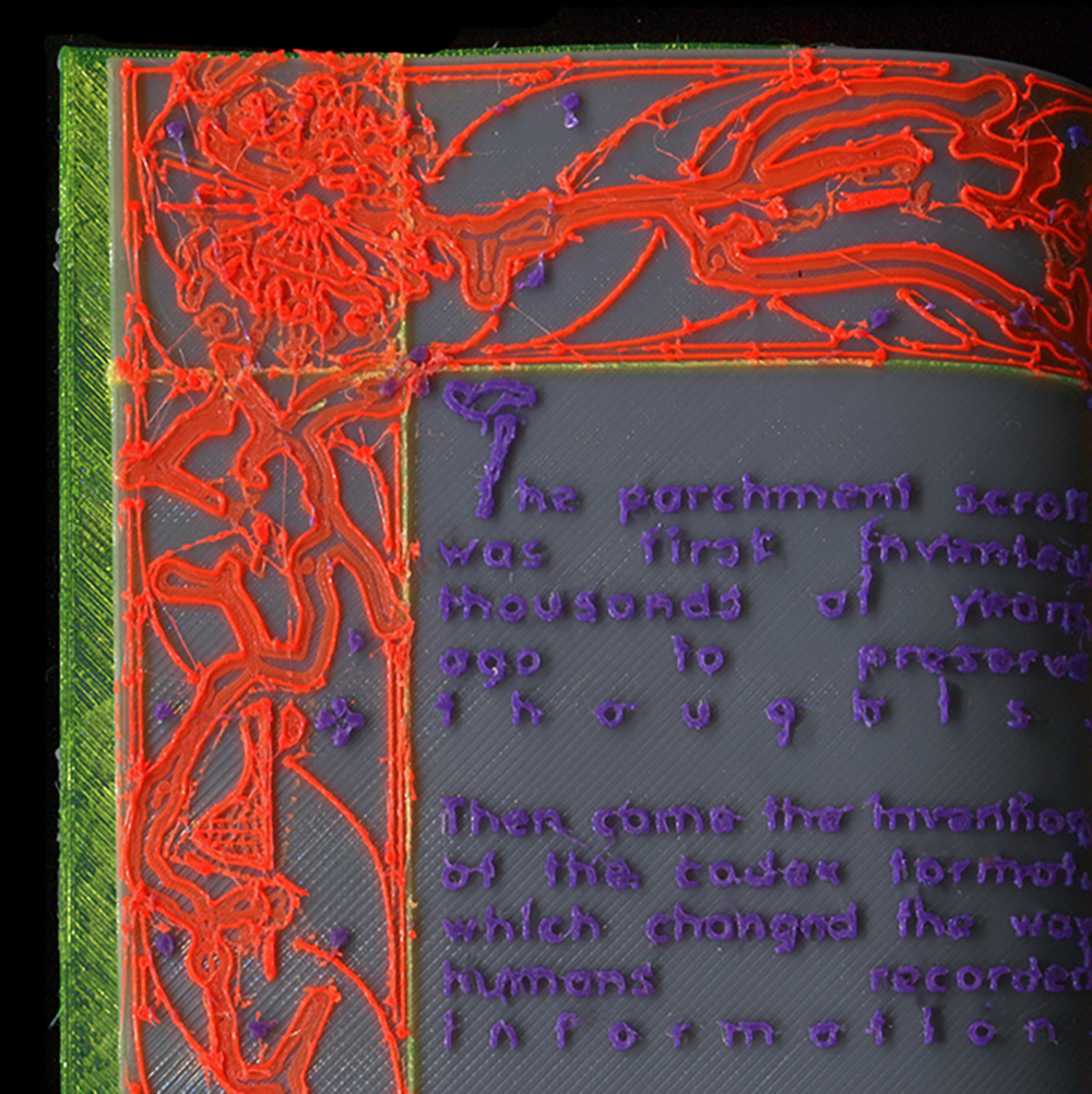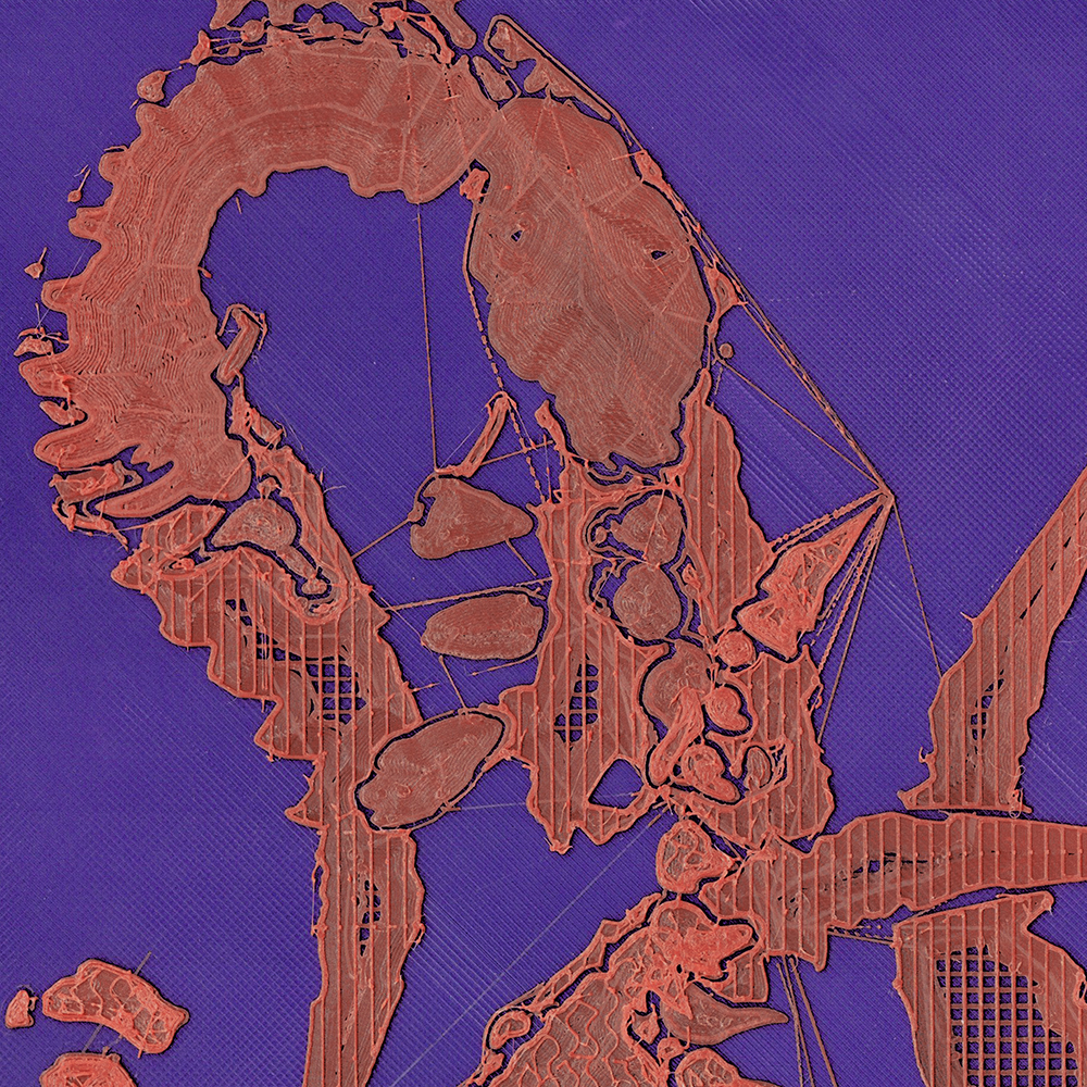 The preparatory step of the 3D printing process can also yield interesting visual possibilities (Fig. 2). Slicing becomes a distinct process for deriving two-dimensional graphics not by marking a surface directly, but by working within a higher dimension (a three-dimensional workflow)—mark-making not just on surfaces, but within volumes.
