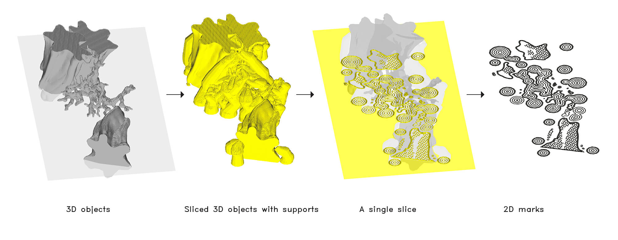 Fig. 1. Step-by-step process of deriving abstract, illustrative graphics from the slicer software.